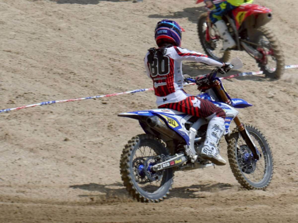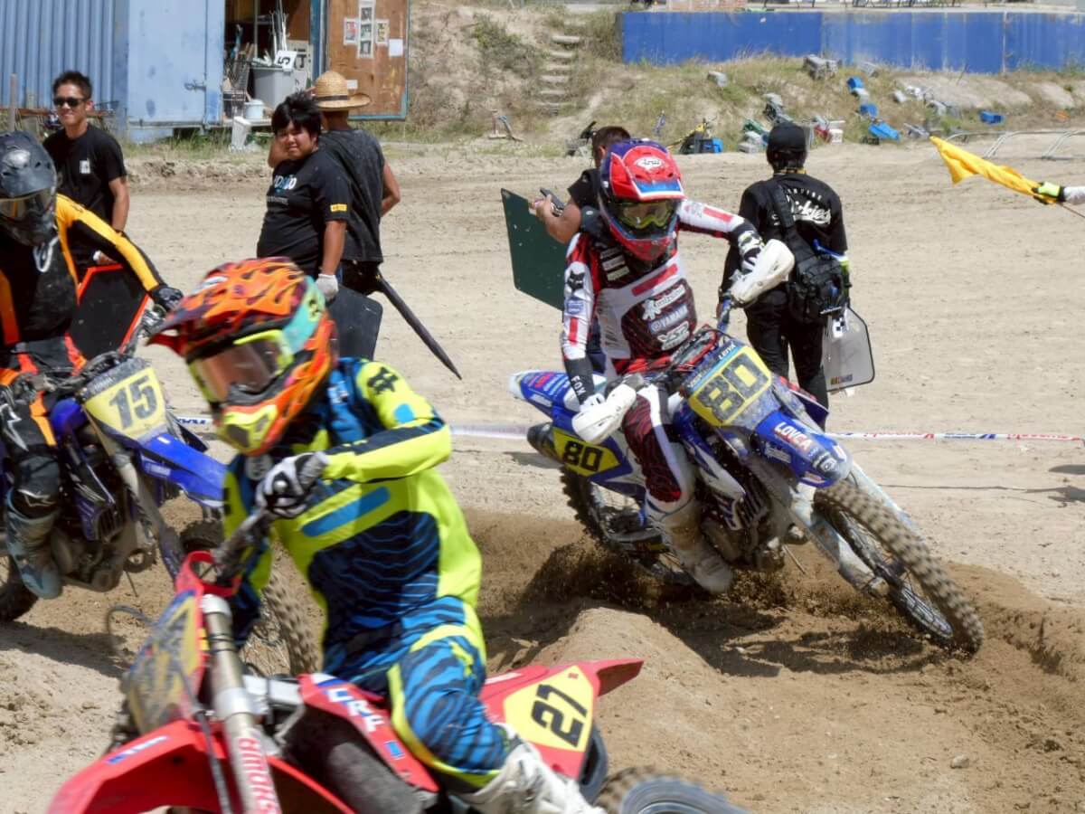 モトクロスは横並びでスタートして時間内の周回数を競います。決勝レースでは第1ヒートと第2ヒートの2回走行し、2レースの合計ポイントで総合順位が決定されます。