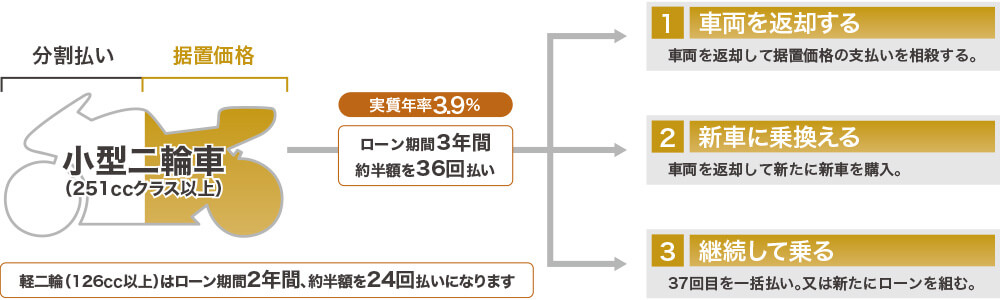 残価分を一括、または分割で支払い続けることでバイクに乗り続けます。